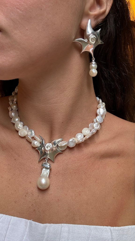 Colar de pérolas com pingente de caracol