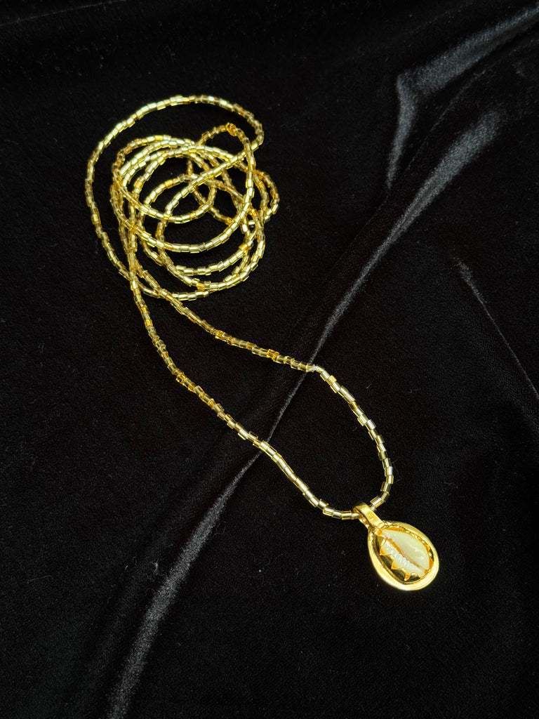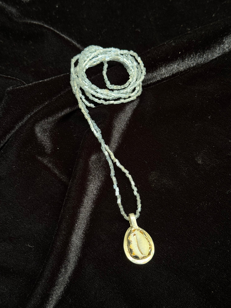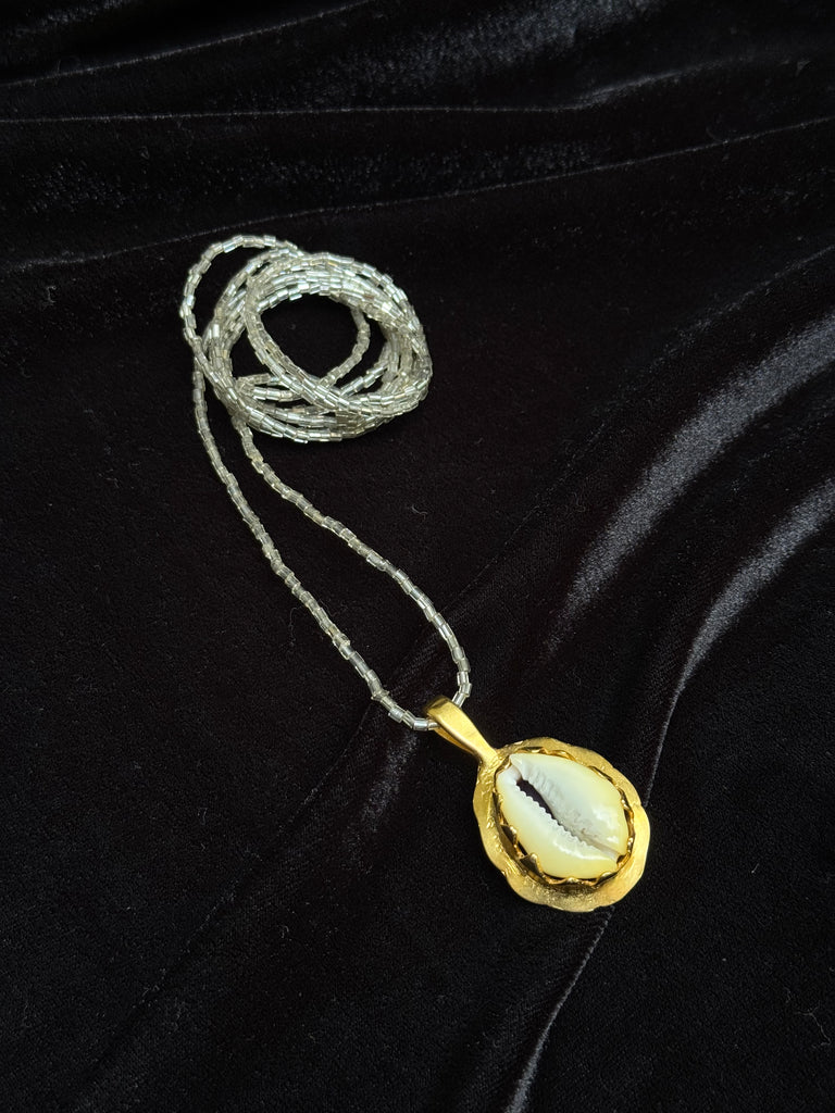 Colar de miçangas coloridas e pingente com banho em ouro e mini búzios natural